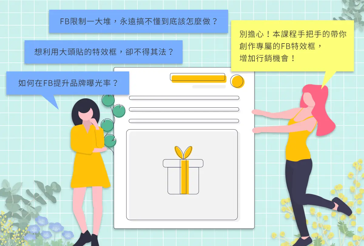 Facebook的特效框是做什麼用的呢?即是在你的FB大頭貼上,加上一些有趣或隱含意義的圖框,具有表現個人特色、表達支持意見或締造宣傳效果等功能。而Frame Studio則是一款由FB推出的相框設計工具,你可以盡情發揮創意,運用它設計出自己想要的特效圖框。因此,想要在FB上宣傳品牌,特效框是你的好選擇。本課程帶你從無到有地創作專屬的FB特效框,既可自己使用,還可分享給他人使用,增加品牌的曝光率!