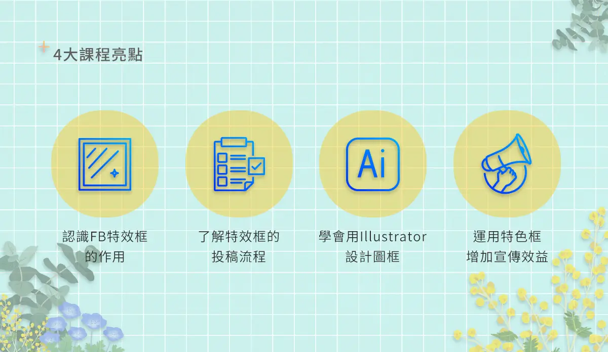 課程從零教起,首先帶你認識什麼是FB特效框,了解使用規範與相關條款;緊接著,教你在Frame Studio建置簡單的特效框並投稿,並運用FB APP進行測試。若要製作專屬,且具有個人風格的特效框,課程內容也結合了Illustrator一併介紹,帶你在Illustrator繪圖軟體裡設計與繪製,打造不一樣的圖框效果。最後,講述如何用粉絲專頁的身分提交特效框,將行銷與設計結合,不僅提升行銷宣傳效果,也展現出個人或品牌特色風格。