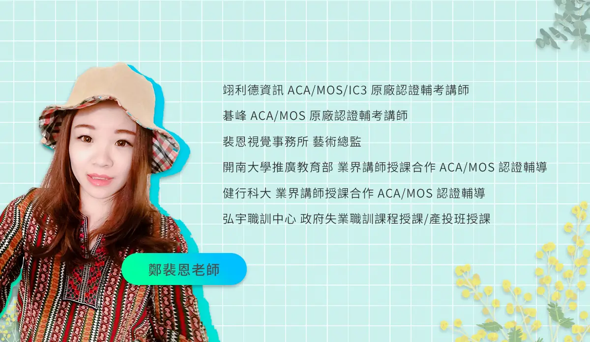 鄭裴恩老師的專長在平面設計、插畫、認證輔導、社群行銷等範疇,不僅多年來致力於高中職大專院校的ACA/MOS/IC3認證輔導課程,更於業界教授平面設計、插畫設計、文創商品設計、影音剪輯編修、動畫特效與網頁製作等領域的專業課程,教學經歷非常豐富。另有撰寫多本未掛名的著作(例如企業內部買斷的教育訓練電子書等)。