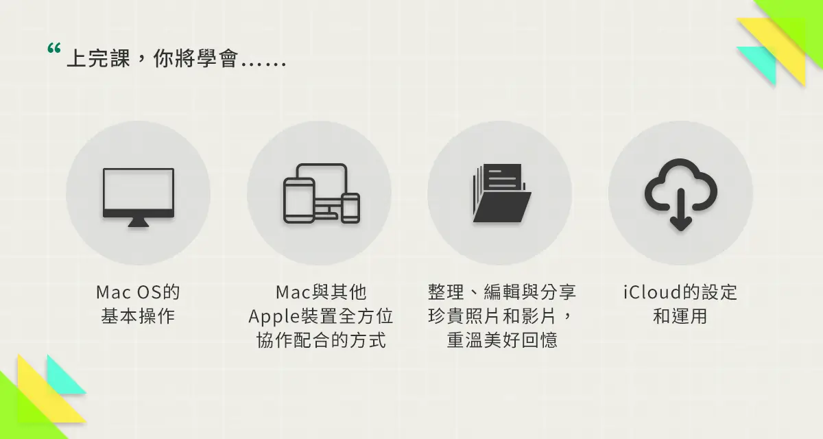 Mac,是個人電腦系列產品,由蘋果公司所設計、開發,因其具備圖形使用者介面而顯得較一般電腦更能直覺使用。雖然Mac的操作已非常直覺,但對初次使用的人而言,可能因為習慣不同等原因,而難以快速上手。因此,本課程將針對初學者和剛從Windows系統轉到Mac OS的學員,一一說明如何有效率地操作Mac電腦。