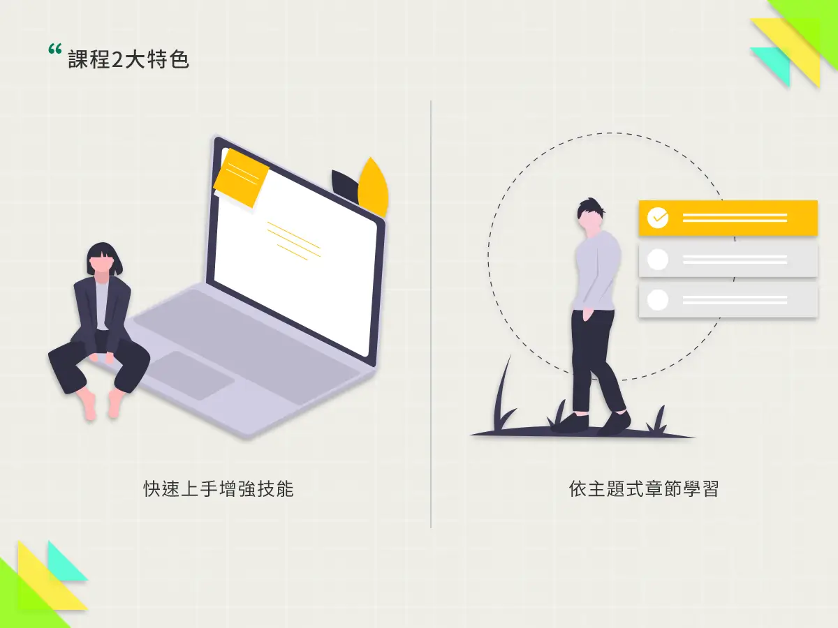 課堂中,老師將循序漸進地教學,從新手最該懂的6件事教起,先學習Mac電腦運用的整體概念,而後便可以開機體驗使用的情況。此外,課程也以Mac電腦的功能做主題式章節的教學,讓學習者更清楚Mac電腦有哪些功能,並且了解當前學習的主題內容。只要依照章節順序學習,將可以逐漸增強Mac OS的操作技巧。