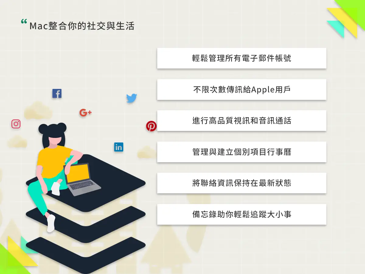 Mac的聯繫與整理功能強大,完整涵蓋你的社交與生活。關於聯繫,如「郵件」功能,即可配合iCloud、Gmail、Yahoo等電郵服務使用,便於管理;又如「訊息」App,可不限次數傳送訊息給使用Apple裝置的人;再如FaceTime,可進行高品質視訊和音訊通話,同樣沒有次數限制。