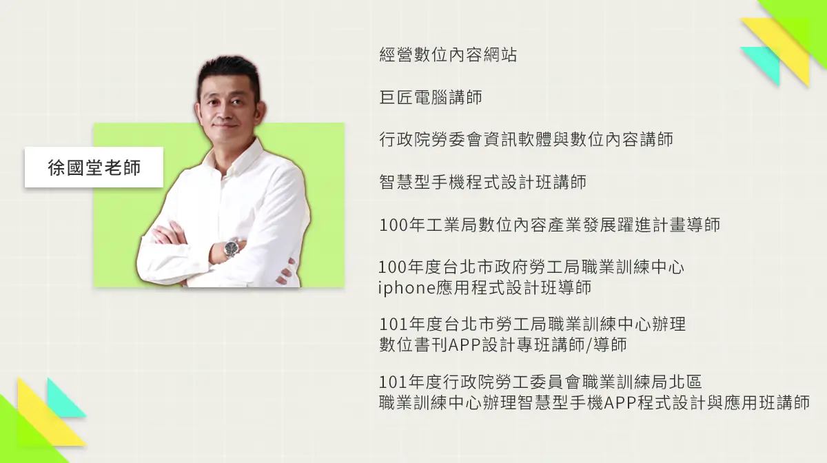 徐國堂老師專攻於程式語言領域,包含手機程式設計、網頁程式、物聯網程式設計等範疇,並曾著有《ActionScript3.0網頁互動特效應用》、《Android+iOS UIDesign行動裝置介面設計》等書。現任iOS的種子講師,有長達20年的教學經驗,教學經驗豐富,且已經有眾多學生就職於相關產業,在各大企業服務,學生所開發出來的應用程式也已經超過50個App。目前正鑽研Apple新世代語言Swift和Android新世代語言Kotlin。