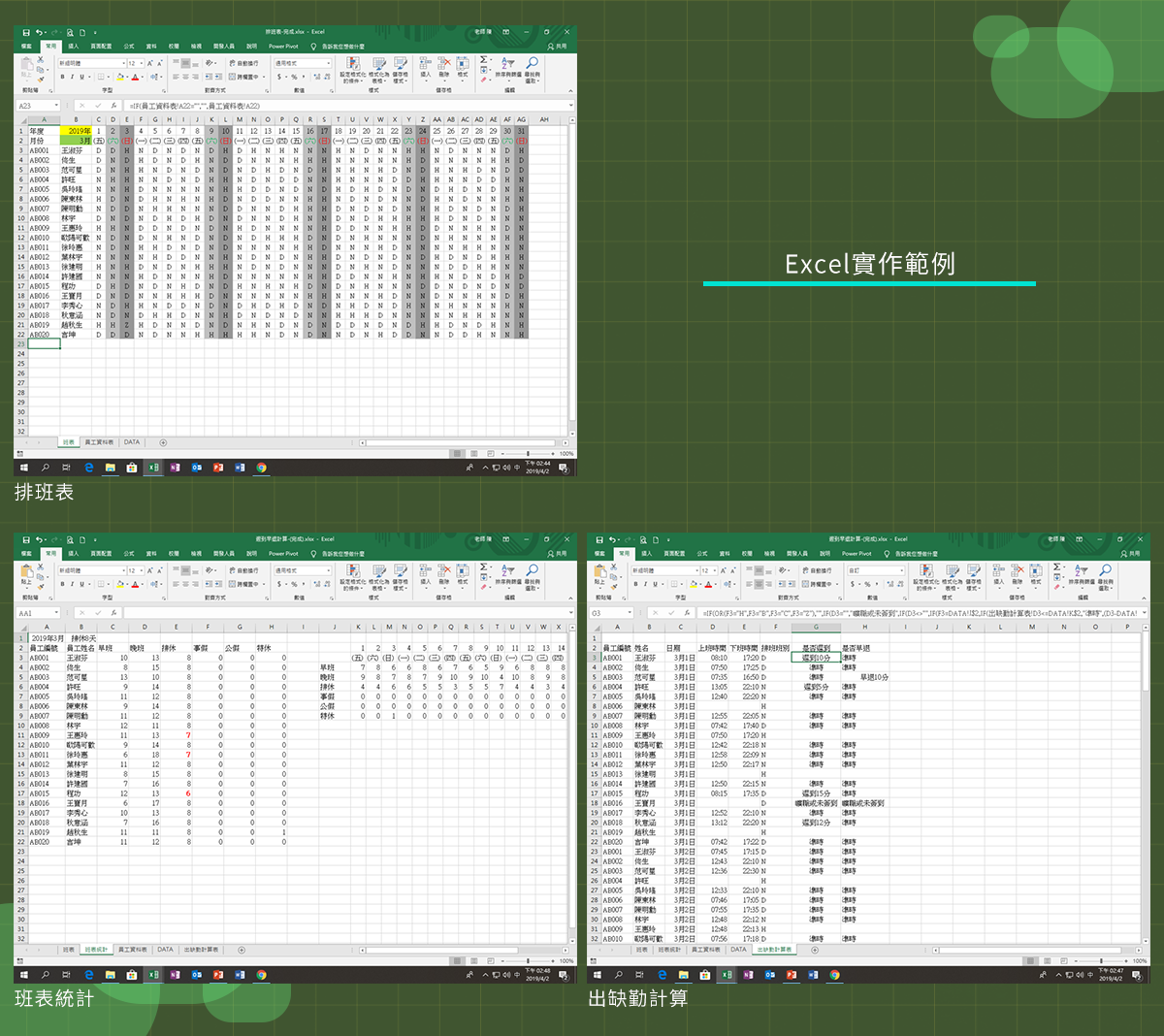 課堂上會有3個實際演練操作的範例,包含排班表、班表統計與出缺勤計算,老師將清楚講解製作報表的每一個詳細步驟與環節,帶你了解美觀又實用的報表是如何完成的。不用擔心學不會,只要跟著老師一同操作範例,學習成效更好,印象更深刻,學會後還能自己靈活應用,有效率地製作出各式各樣精美的報表,提升報表質量,加快工作速度。