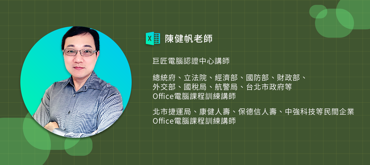 陳健帆老師非常擅長Office應用軟體,最主要的專長在於「設計報表」,進而解決報表上的實務問題,整合Office軟體,達到提高工作效率的目的。長年從事企業實務報表製作,曾在各大政府機關、民間企業等擔任電腦課程的訓練講師,教授Office軟體,業界與教學經驗都很豐富。