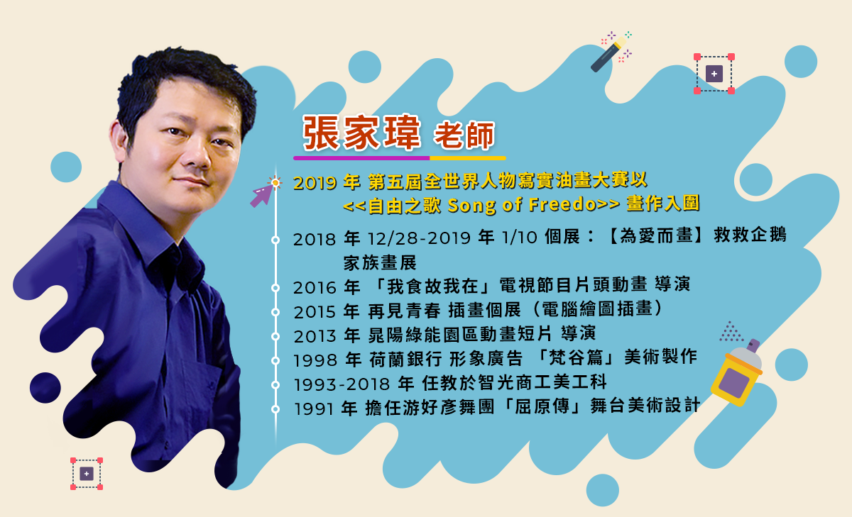 張家瑋老師嫻熟古典技法與現代繪畫技巧,致力於教學與研究電腦繪圖已有 20 年,出身於正統藝術學校,秉持著深厚的美術底蘊,且不斷研究跨領域的電腦技能,包含網頁製作、Flash 動畫、Painter 自然彩繪等,務求將傳統與數位電繪結合,創造出獨一無二的繪圖方式!