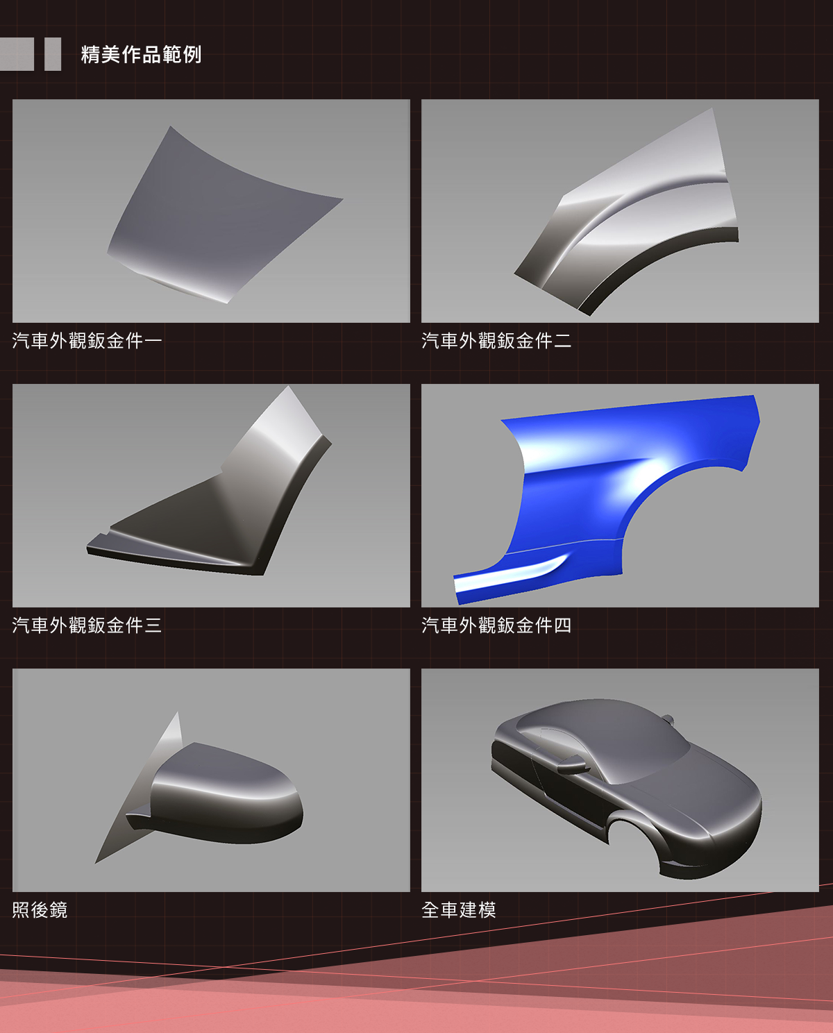 課堂上提供豐富的範例教學,以高階建模造型為主,皆為汽車中的各色裝備配件,包含汽車外觀鈑金件、照後鏡、全車建模等多樣化案例,務求培養汽車建模的複雜技巧。老師將帶你領略資深汽車數模師的觀點,一步步操作與繪製出逼真且精緻的完整汽車模型,熟悉軟體操作與產品設計的概念與方法,快速學會產品建模中,最高、最複雜且最困難的領域——汽車外觀建模。