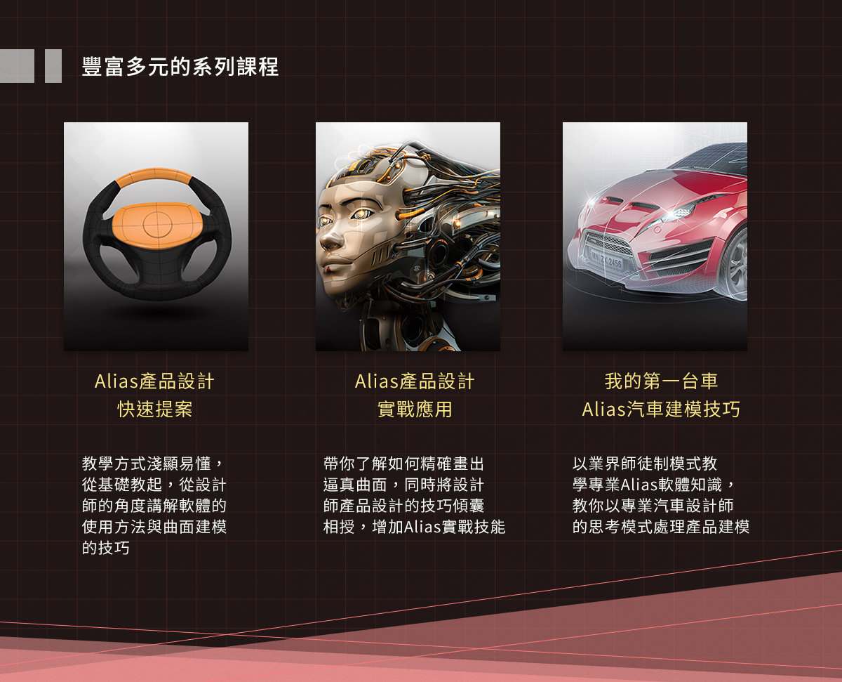 雖然市面上有一些教授Alias軟體的課程,但僅講述軟體的使用方法,而未能將教學內容與業界結合,因此造成很多人雖具備Alias軟體技能,但真正進入到業界工作時,卻面臨到不知如何將設計好的產品圖,調整成可實際量產的模型。本Alias軟體系列課程以系統化的方式進行教學,從設計的環節教起,一路講解到實際生產的流程,讓你能快速擁有符合業界水準的建模實力,縮短自我摸索的時間。