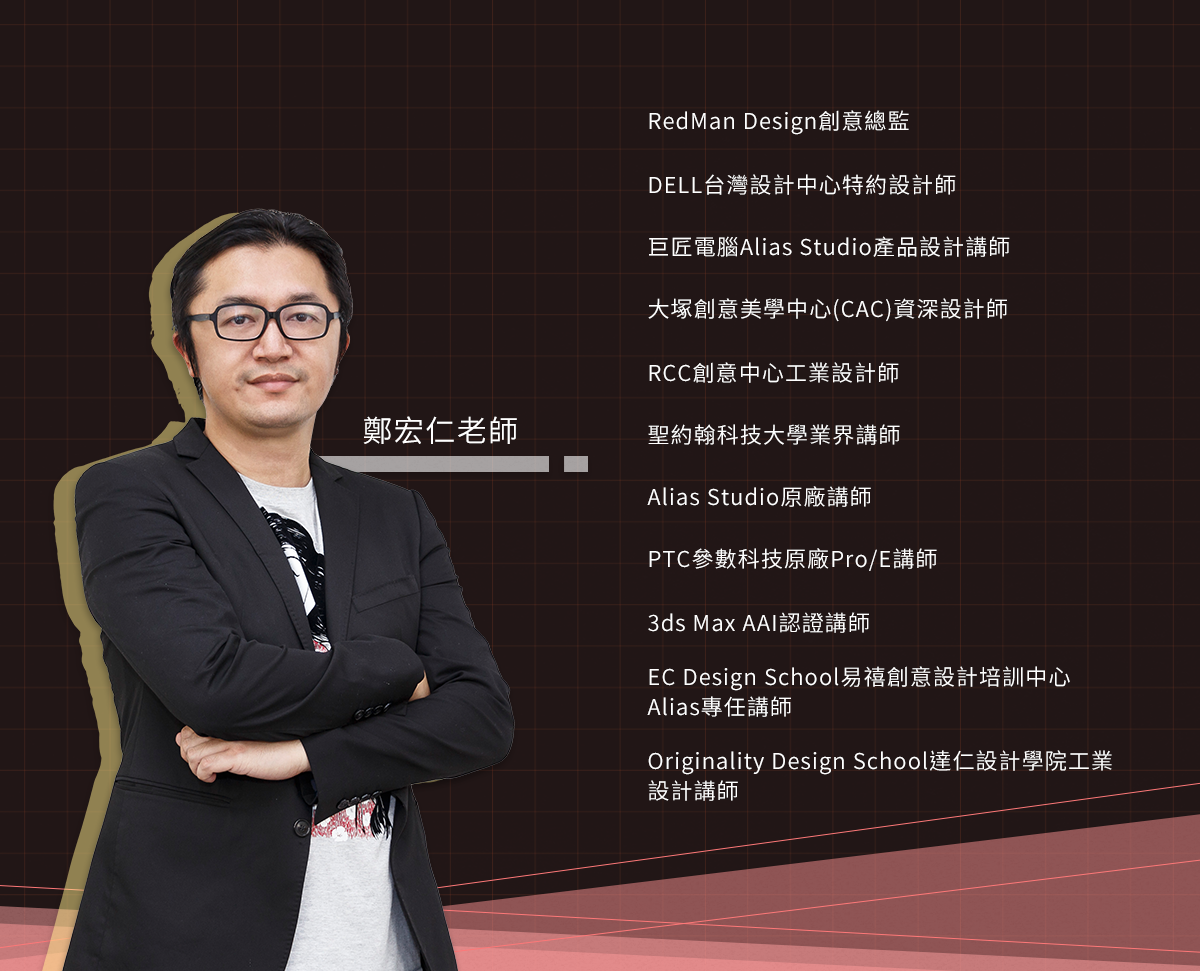 鄭宏仁老師現任REDMAN STUDIO創意總監,完成過許多國際級廠商的專案,亦曾擔任巨匠電腦產品設計類講師、CAC資深設計師、Alias Studio原廠講師。從處理Alias汽車等級曲面開始,到經營設計公司已有10多年的時間,業界經驗相當豐富,近年致力發展3D影像的照片級擬真技術。熟悉多套不同類型的3D軟體,並結合多年實務與教學經驗,將軟體的觀念與技巧以最為淺顯易懂的方式教學。