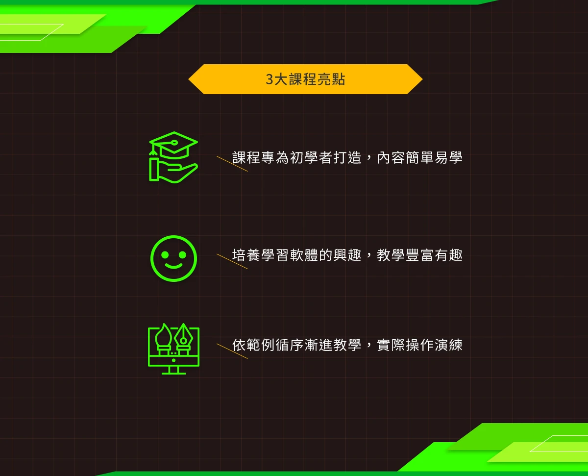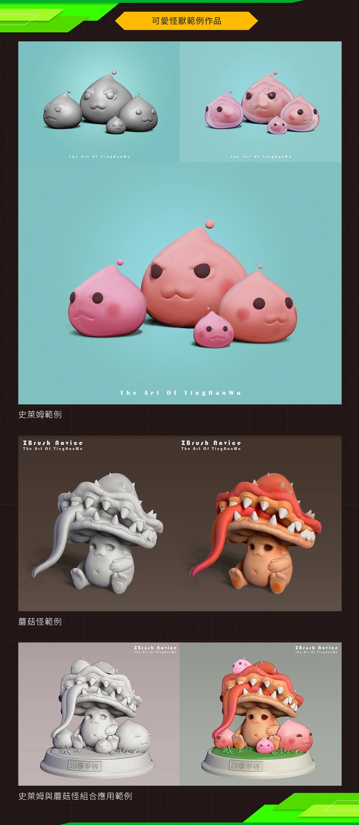 本課程的單元設計專為初學者打造,讓對3D動畫設計有興趣的初學者能輕鬆入門,培養興趣,進而得以持續往更專業的領域邁進。課程共有三大單元,分別是ZBrush軟體基本教學、史萊姆範例製作與蘑菇怪範例製作。若僅是學習軟體功能可能會感到有些無趣,往往較難以產生興趣與成就感;因此課程設計成像是玩RPG遊戲的體驗,循序漸進地練功打怪,由簡易範例到完整作品,帶你進入3D的世界!