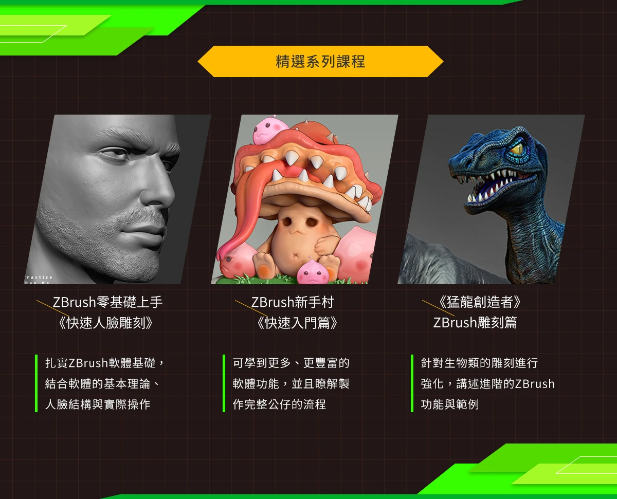 ZBrush系列課程包含「ZBrush零基礎上手《快速人臉雕刻》」或「《猛龍創造者》ZBrush雕刻篇」,前者會更全面地講解ZBrush的軟體介面與功能,而後者則會針對生物類的雕刻進行強化與演練。所以,無論你是2D設計師、插畫師、遊戲設計師等相關職業,或是對3D動畫設計專業領域有興趣的人,都非常適合學習這一系列課程,加強自己的3D設計力,更強化職場競爭力。