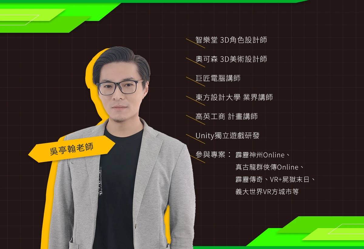 吳亭翰老師專長在次世代角色與場景製作、風格化角色製作、影片後製剪輯與遊戲開發設計領域,進入遊戲相關產業已有數年之久,因參與過多款萬人線上遊戲、手機遊戲、遊戲宣傳片及VR/AR遊戲製作等,故最能理解業界喜好與潮流之脈絡。除了精進自身技術及美感,也累積了豐厚專業的實務經驗。教學上,以幽默且不失專業的角度授課,分享多年業界經驗,使學生能融會貫通的學習,並與職場直接接軌。