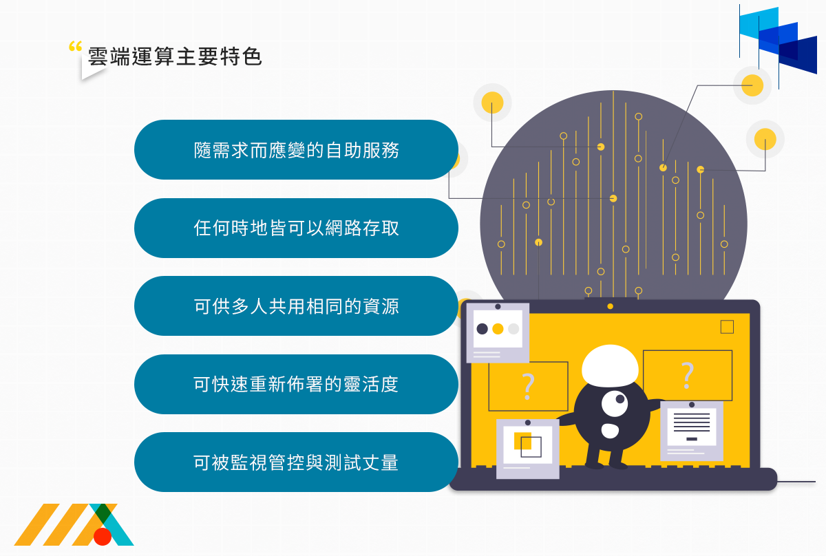 Computing)並非如此簡單,它是一種基於網際網路的運算方式,主要特色是虛擬化的技術,並建立在幾個重要基礎上,包含隨需求而應變的自助服務、任何時地皆可用網路裝置存取、可供多人共用相同的資源、可快速重新佈署的靈活度、可被監視管控與測試丈量等。