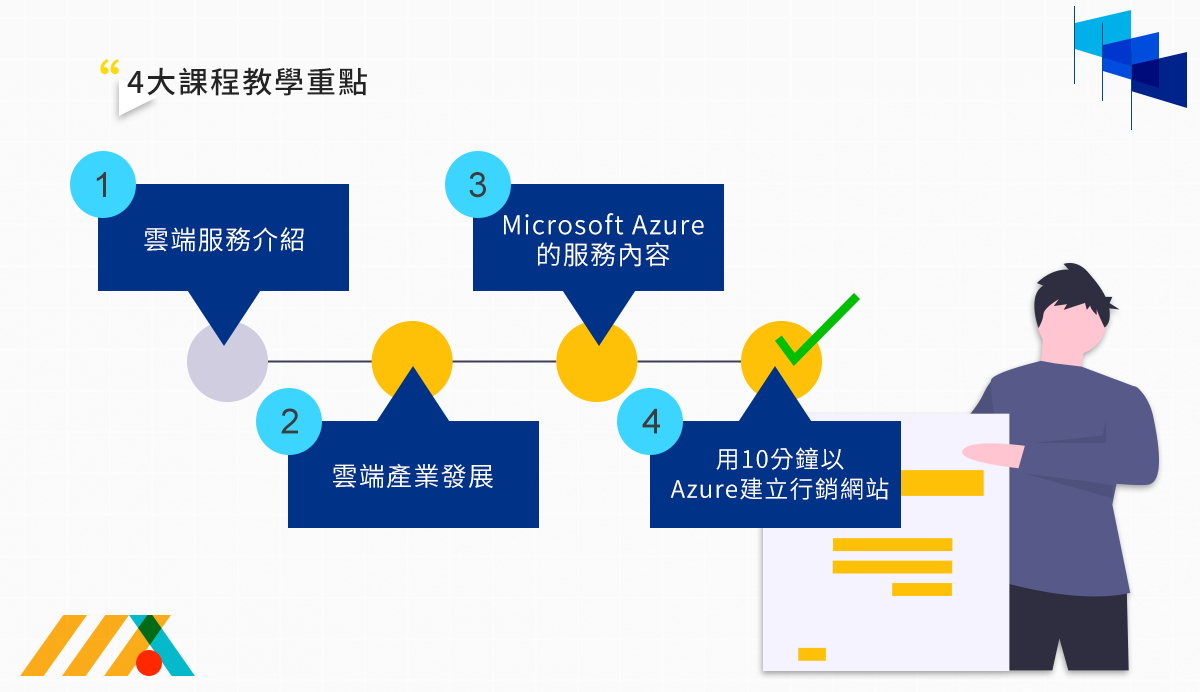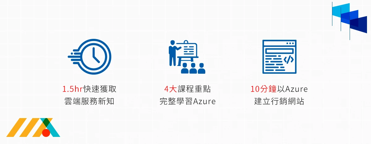 Azure的定義以及雲端上的應用。同時,老師也將談論雲端服務的概念,並協助學員了解雲端服務產業的新趨勢與未來發展,讓你做好跨入雲端服務產業前的準備,開創自己多元的職涯可能。此外,除了講解觀念,老師還會帶你用Azure建立一個行銷網站,實際去體驗Azure的特色,加深記憶與理解。