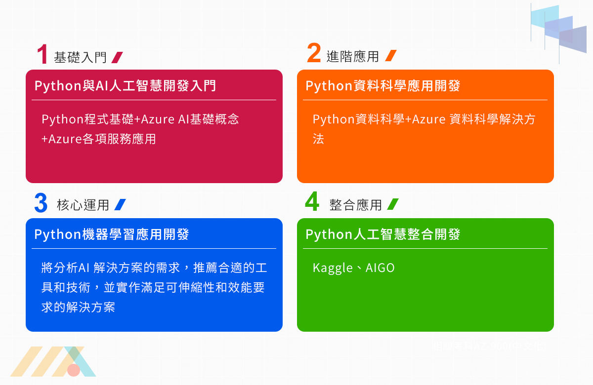 上完課,你還可以深入學習Azure相關領域的課程,包括AI人工智慧開發、資料科學應用、機器學習應用開發與人工智慧整合開發等,不僅搭上時下流行的AI潮流,也讓你的學習脈絡能更加完整,知識體系也能更加完備。