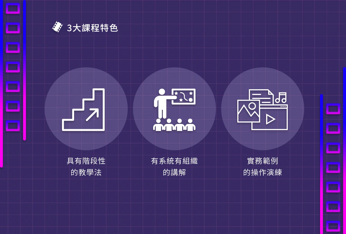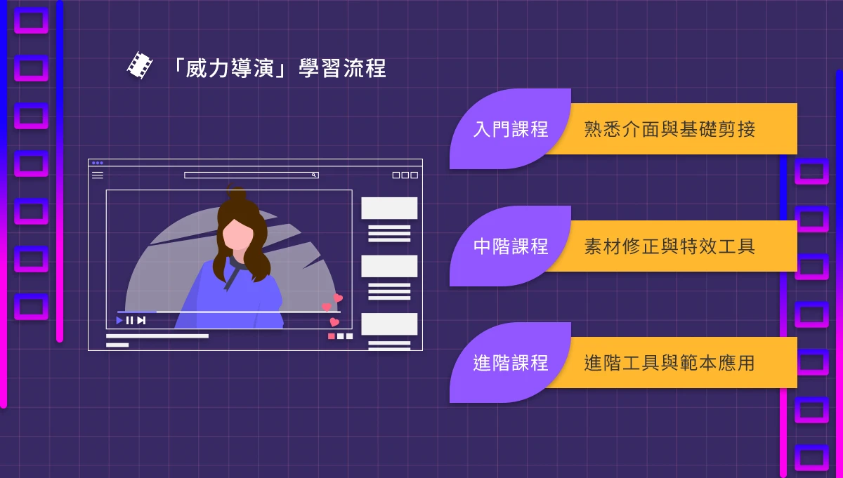 本課程分為三個階段進行教學,分別為入門、中階與進階課程,老師有系統地講解,並且完整示範影片剪輯功能,帶你快速了解威力導演這款影片製作與剪輯軟體的優勢,訓練你以非線性的思考方式進行剪輯工作,提供一個從入門到精通最快速的捷徑,適合對影片製作有熱情與想法,期待能自行完成影片製作的人。