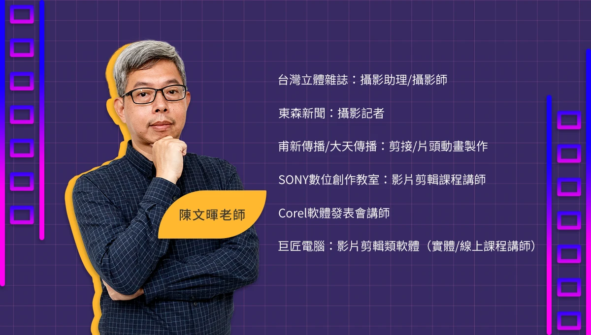 陳文暉老師的專業在於攝影、錄影領域,擅長會聲會影、威力導演、iMovie、Premiere Pro、Final Cut Pro、After Effects、3ds Max等影片剪輯與製作軟體,曾擔任台灣立體雜誌攝影助理/攝影師、東森新聞攝影記者、傳播公司動畫師等職務,業界實務經驗豐富。此外,目前也在SONY數位創作教室與巨匠電腦擔任講師,希望將影片剪輯與製作的技巧,傳授給對這領域有興趣與熱情的人。