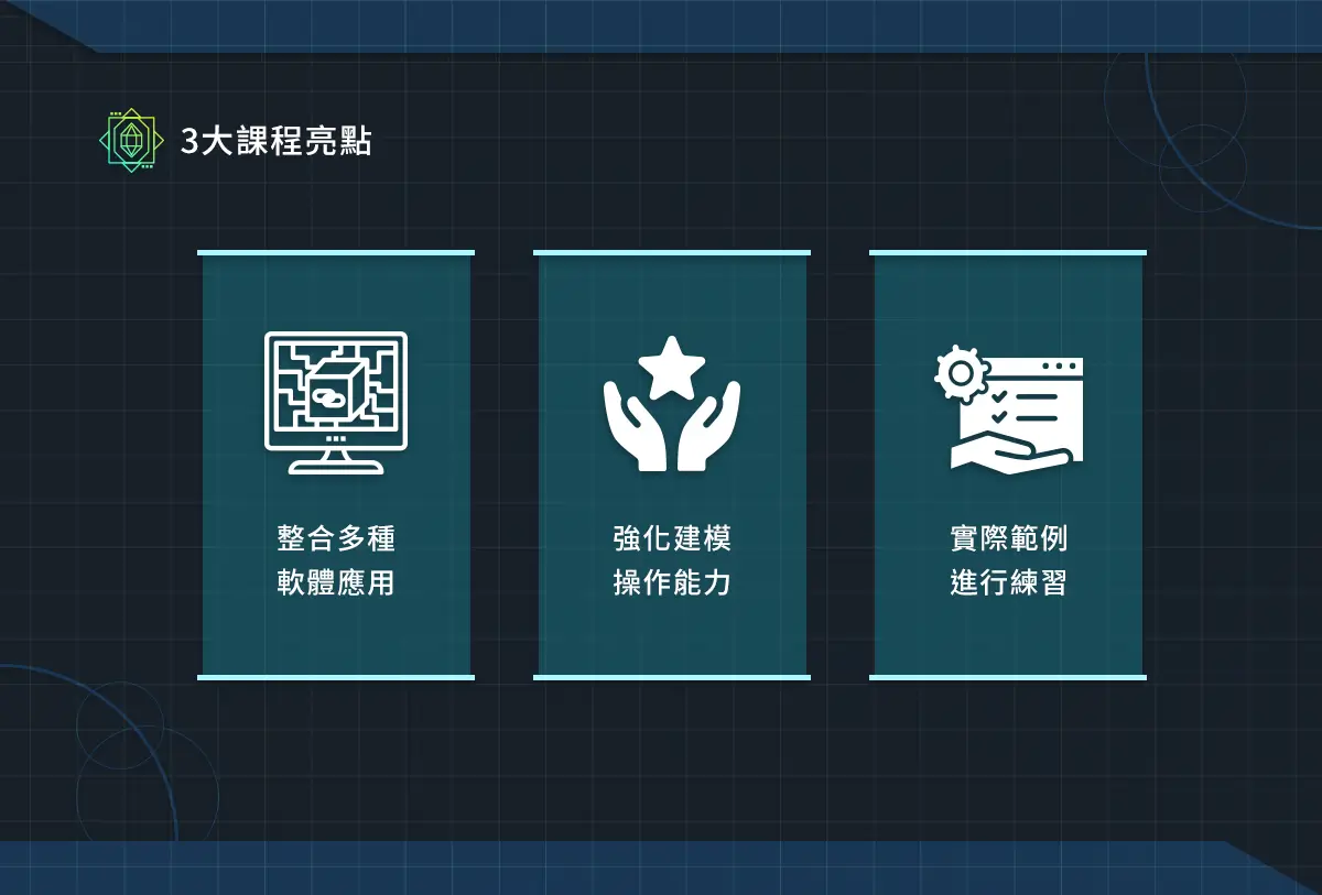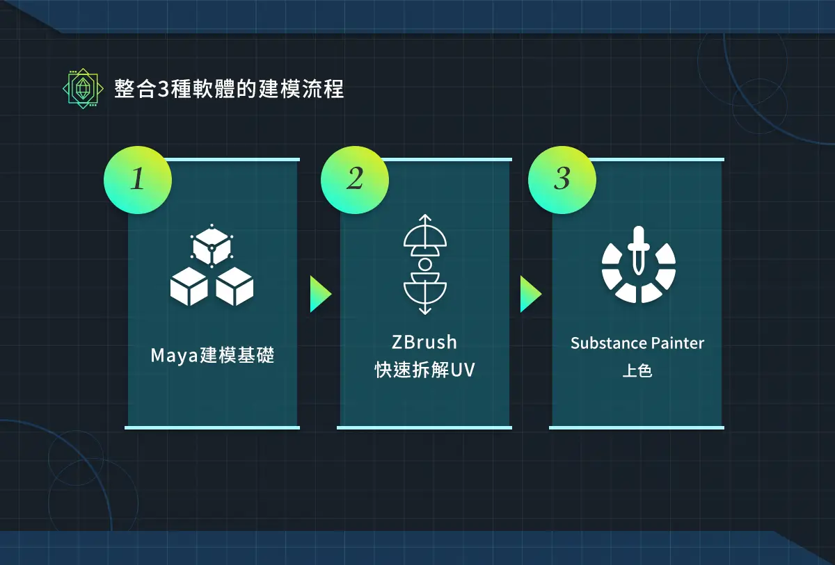 課堂上主講Maya,教學如何結合運用Maya、ZBrush與Substance Painter。其中Maya配合ZBrush,可快速建模,並提升模型細緻度,讓整體完成度更好。至於Maya配合Substance Painter,則能讓模型的貼圖上色更直覺、精緻,同樣能讓模型整體的完成度更加優秀。此外,若再深入學習ZBrush,還可用它去處理遊戲角色設計、3D列印;而若再深入學習Substance Painter,則可用於其他3D軟體及遊戲引擎(Unity、 Unreal)的貼圖繪製等。本課程讓你一次接觸3種業界常用軟體,厚實職場力。