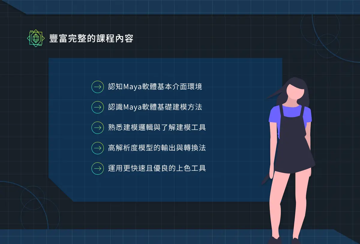 在學習本課程前,你可能在運用Maya軟體進行建模與上色時,往往難以精細地表現出作品外觀的具體情況;學完後,不僅能增加對軟體的掌握度,更可對模型外觀與上色方法有更深一層的了解,提升建模的技巧。本課程以7小時的質感教學,帶你深度認識Maya軟體建模,並整合多軟體的應用,從軟體介面與環境的熟悉,到實際動手建模,再到畫面輸出,都能有比起以往更完整深刻的了解。