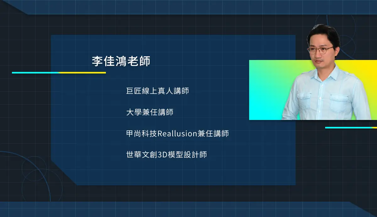 李佳鴻老師專長在於3D動畫等相關領域,過去曾製作過多款影片,如客家電視台「我的NO1表情」片頭設計、高雄園冶獎片頭設計、醫院也瘋狂動畫影片設計等優質作品。現擔任巨匠線上真人講師、大學兼任講師、甲尚科技Reallusion兼任講師、世華文創3D模型設計師,不僅業界經歷豐富,教學經驗也相當豐富,並將二者結合貫通,傳遞最實用的實務經驗給學生。