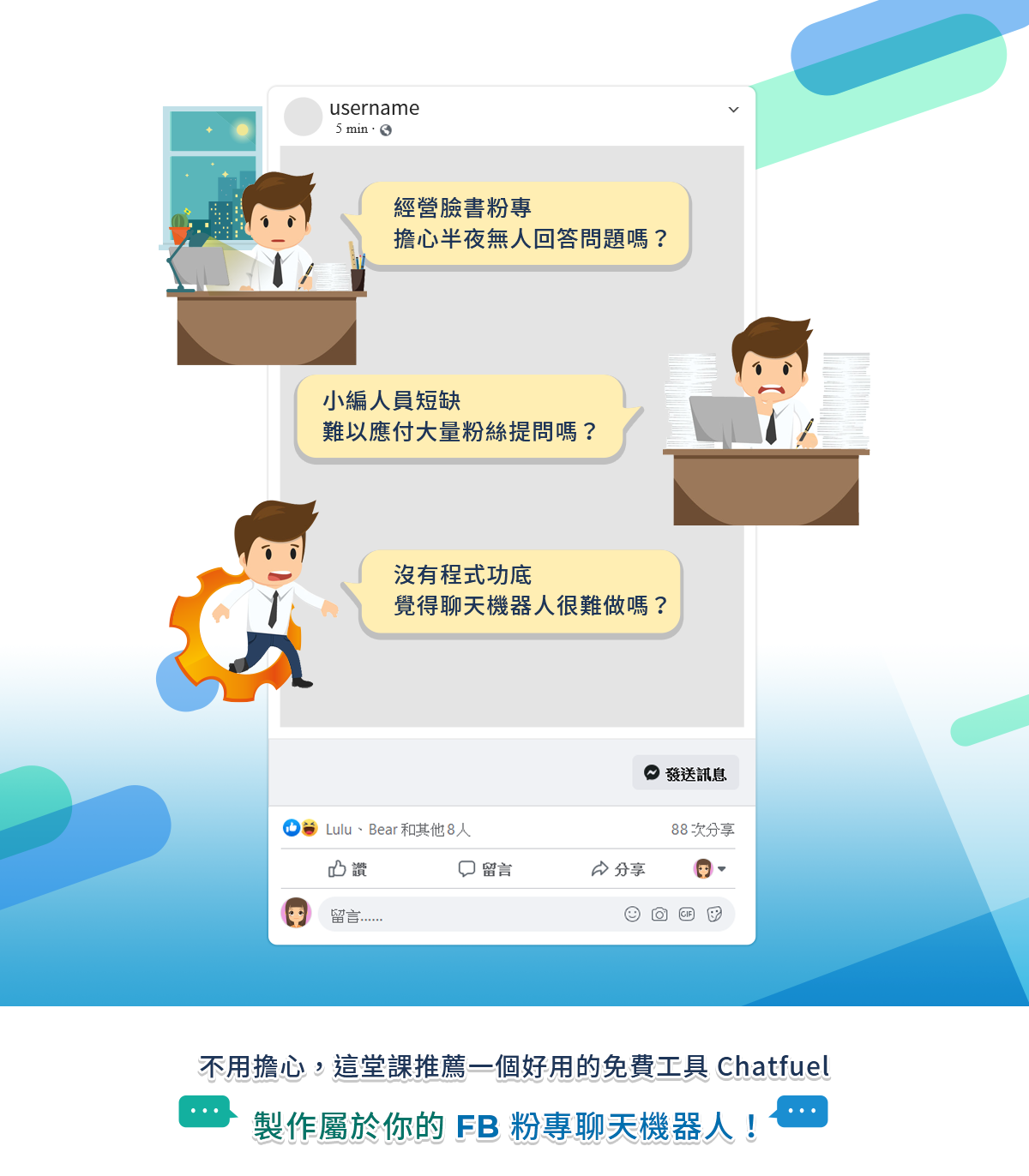 無論你是粉絲團經營人員、社群小編、行銷人員或技術人員,都非常適合學習 Chatfuel,有效幫助公司臉書官網、個人品牌專頁等,建立一個友善消費者的聊天機器人。