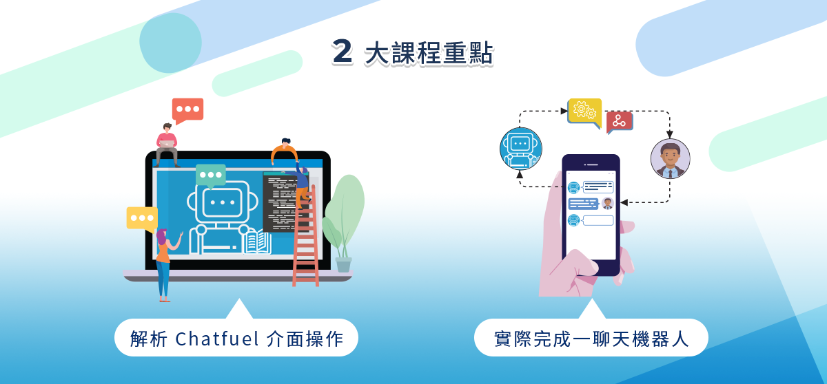 課堂上,老師將用一小時教你使用 Chatfuel,上手簡單,無須撰寫程式碼,只要按個按鈕,就能立刻製作出專屬的聊天機器人。有別於坊間過於強調技術的課程,本課程以 Chatfuel 這個優秀工具為主題教學,受用層面更廣,不受個人程式程度的限制,任何人都可輕鬆入門,並很快就可應用於工作或生活中。