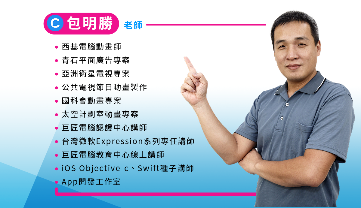 包明勝老師研究領域廣泛,早期以視覺設計的研究為主,熟稔以程式處理圖像、特效運算,也熟悉互動、人機設計等領域。舉凡視覺應用 3D、2D、圖表、混合圖層等技巧都在涉獵的範圍,並頗有心得。同時,老師也致力於教育學子,在前後端網路技術、iOS App 開發已有 20 年教學經驗,時數更超過一萬個小時。