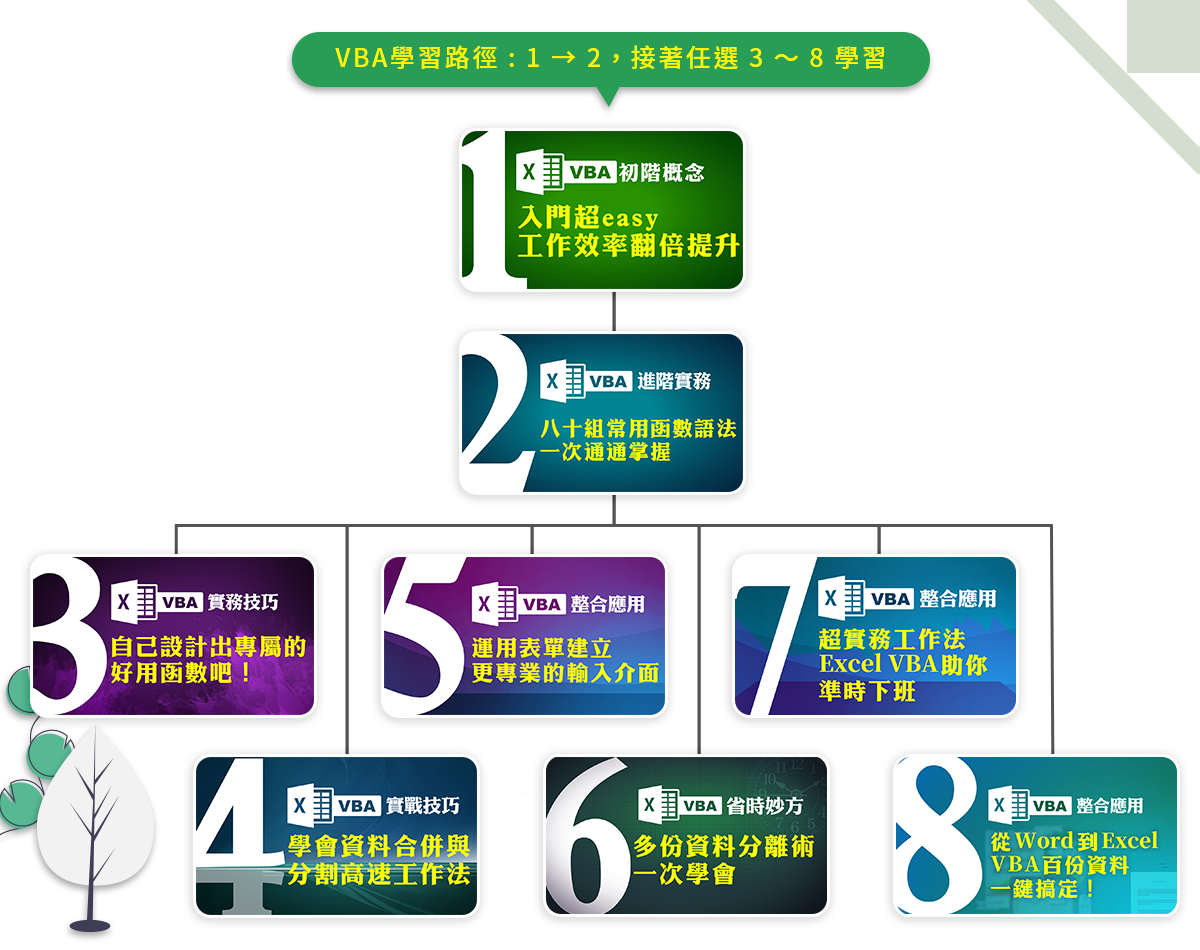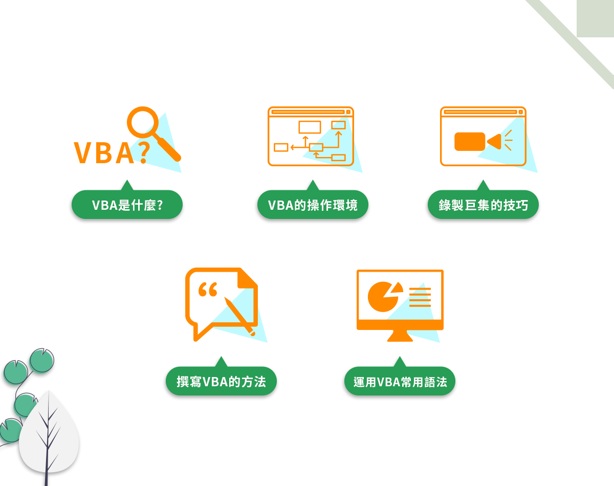 學VBA感覺好像很難,不過別擔心沒有程式底子,本課程特別為初學者設計,帶領你從認識VBA開始,內容包含了解什麼是VBA和它的好處、熟悉VBA的操作環境、錄製巨集的技巧、撰寫VBA的方法以及運用VBA常用的基本語法等,一步一步跟著老師輕鬆掌握VBA,學會一鍵解決重複操作與資料整理。