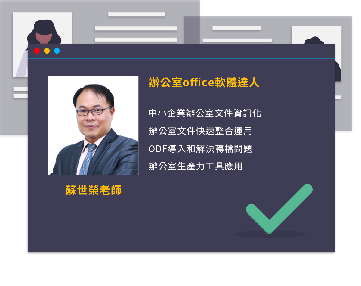 蘇世榮老師的專業強項在於辦公室文件(office軟體)的資訊化與快速整合運用,以及ODF導入和轉檔,教學時相當擅長以實際案例將複雜內容清楚表達,並在各個政府機關和大專院校擔任過專任講師,長年致力於教學,經驗相當豐富,教齡長達25年,更有眾多精采的著作。
