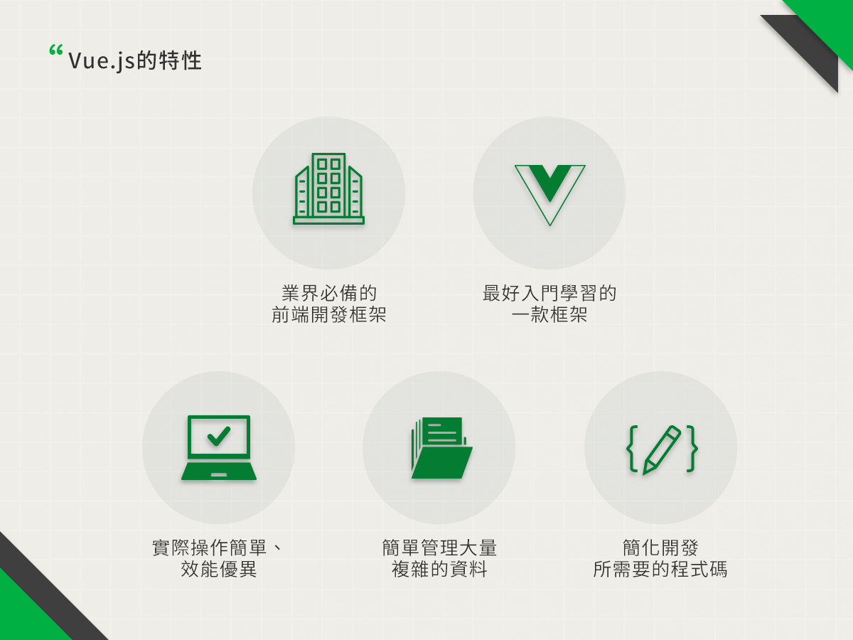 在初學網頁時,一定會用到的就是jQuery,它可透過簡單的方法輕鬆操作頁面上的元素。這些方法用起來真的非常簡單,但是,只限於開發單一頁面!如果今天是開發小型網站,或任何有大量資料的頁面,就會發現不容易掌控資料,資料會分散在頁面的各種位置,久而久之還會造成維護不易。本課程所教學的Vue.js,它所扮演的角色就是幫助你如何在頁面上有循有序地呈現、處理資料,將所有的資料集中在相同一處,更便於管理。