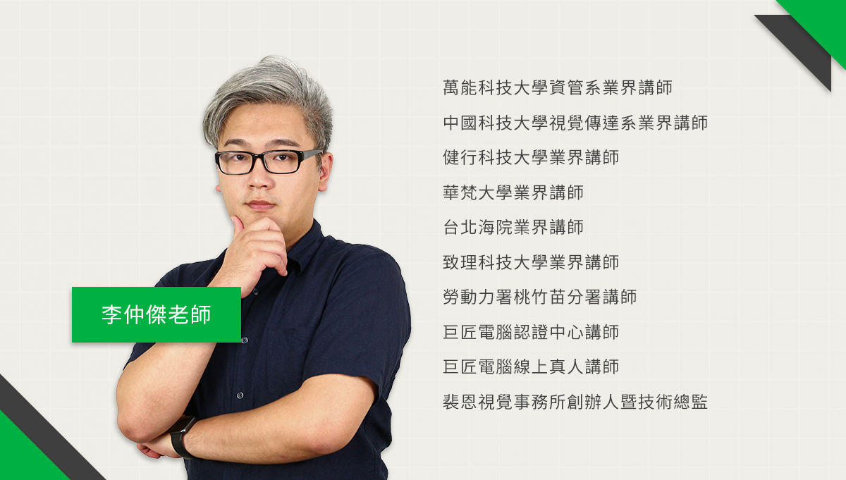 李仲傑老師專長在前、後端的網站開發、平面設計、廣告合成等領域,有非常優秀的表現與成果,且擅長各類程式、軟體運用,如HTML5 & CSS3、JavaScript、jQuery、Vuejs、Git版本控制、PHP、MySQL、Photoshop、Illustrator等,並撰有《RWD跨平台響應式網頁設計》。同時,教學經歷也相當豐富,曾在各大專院校擔任講師,並在各政府與教學機構開班授課。熱愛教學,期待帶領同學克服各種學習難點。