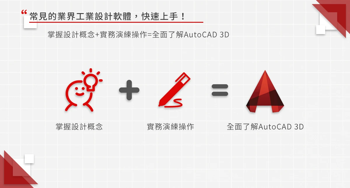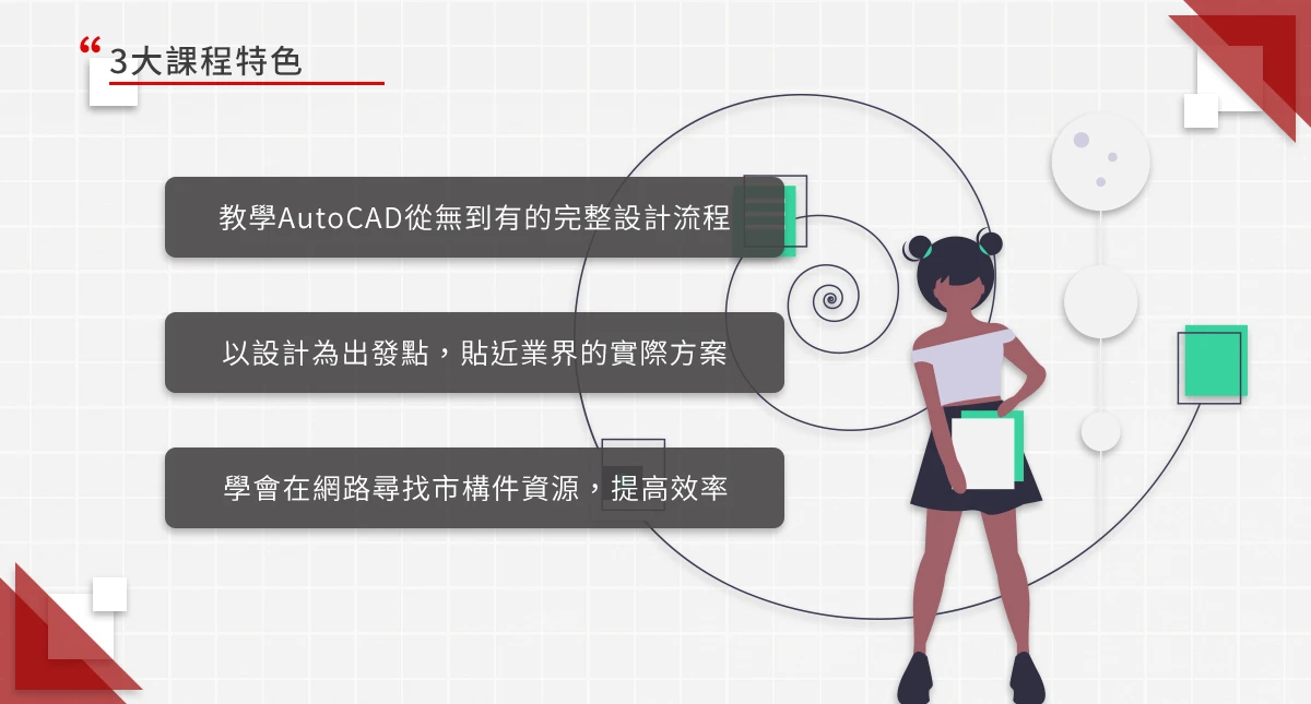 AutoCAD由美國Autodesk公司開發,為全球知名的電腦輔助設計與繪圖軟體,也是在台灣工業設計產業中被廣泛使用的製圖軟體之一。AutoCAD應用範疇廣,包含土木建築、室內設計、機械模具、電子電機、消防空調、工業設計、景觀設計、環境工程、地理資訊等。本課程教學是以「設計」為出發點,非一般課程的「抄圖」學習。上課前並無完整的尺寸講義可供模仿,而是在畫圖過程中設計尺寸,讓你對AutoCAD設計概念與流程有更深入的了解。