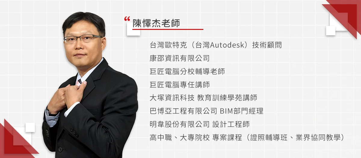 陳懌杰老師自學生時期就開始接觸電腦輔助設計,曾擔任過機械加工廠的設計工程師,並在Autodesk原廠擔任技術顧問,業界實務經驗豐富。此外,更從事教育訓練工作超過15年,教學領域橫跨機械與室內,能以完整且具系統性的教學方式幫助初學者能一步一步學習,進而與實務結合。持有多項Autodesk、SolidWorks原廠證照等。