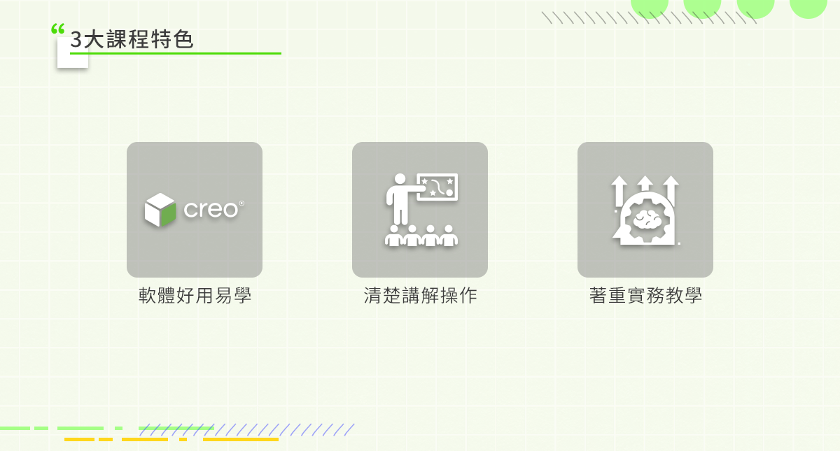 老師將以實物建模的教學方式,帶你了解CreoParametric 5.0自由樣式的基本操作及技巧。同時,也將輔以多個設計案例讓你在實務練習中熟悉CreoParametric 5.0自由樣式的操作流程,以掌握每個細部環節與製作脈絡,未來得以靈活應用到其他的模型設計與建造中。