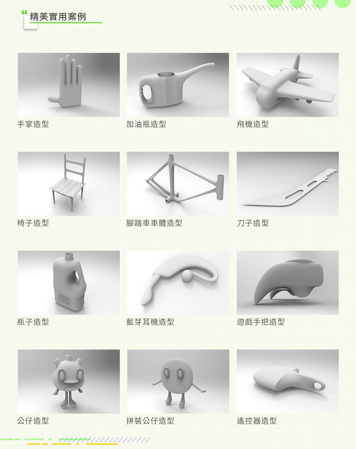 課堂上,教學的內容共分兩大部分,首先帶你認知軟體介面與功能,包含原始元素、加厚、實體化、轉換、引伸、縮放、連接、層級調整、鏡射等工具。之後便進行繪畫的實務操作,精選超多生活中常見的實用造型,包含有手掌造型、加油瓶造型、飛機造型、椅子造型等,讓你除了熟悉介面功能,更可以在課中學到如何處理與完成各色生活物品,並可立即運用到自己的建模工作中。