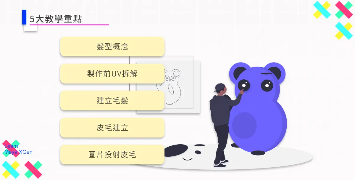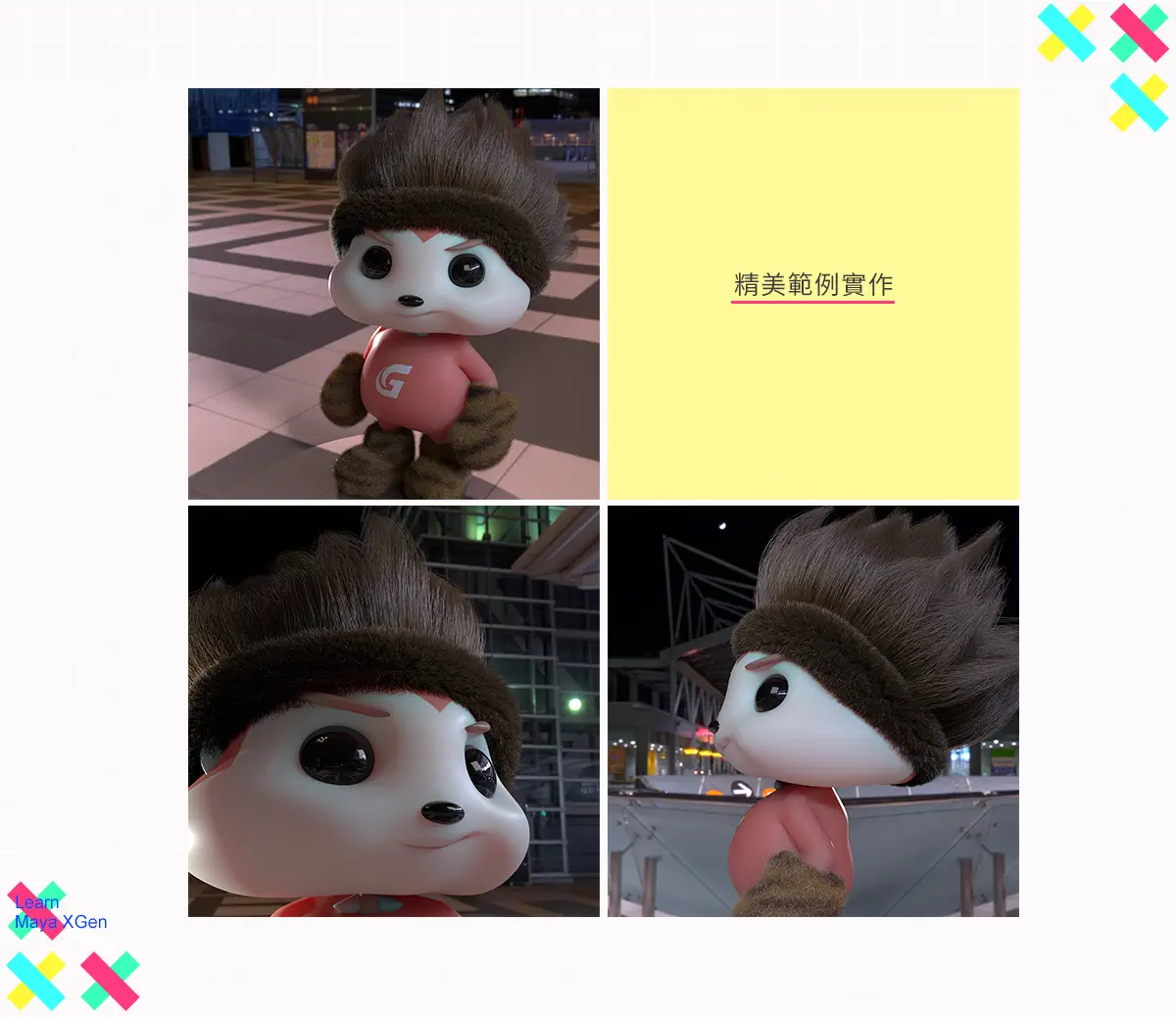 除了講解毛髮創作的基礎觀念,老師也將一一實際操作Maya XGen製作毛髮的步驟與流程,並輔以清楚詳盡的解說,只要跟著老師的教學進程,就能逐漸了解Maya XGen的操作訣竅與方法,實作出可愛造型人物的毛髮,未來更可應用在其他角色的創作上。