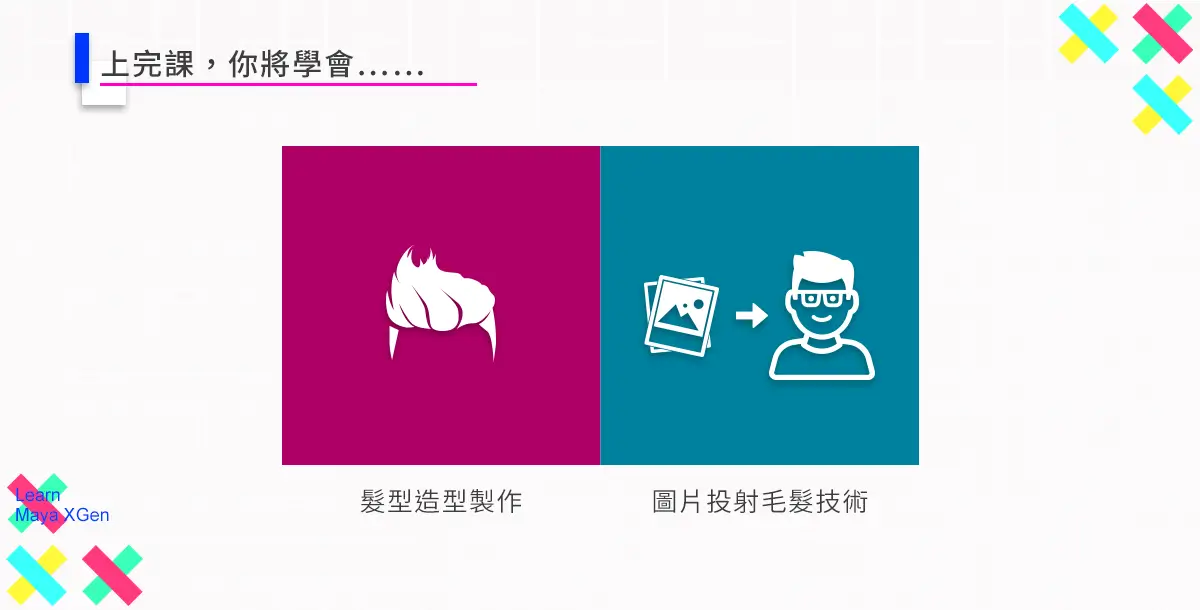 課堂上,老師將從髮型概念教起,先了解製作前需要做什麼準備。之後便開始進入軟體教學,帶你一一處理角色的髮型設計與製作,最後則從毛髮到皮毛,不僅局限於身上的毛髮,而教學物品中的皮毛製品如何處理。學會毛髮處理,全方位了解Maya XGen製作毛髮與皮毛的步驟與方法,賦予你所創作的角色栩栩如生的生命力與感染力。