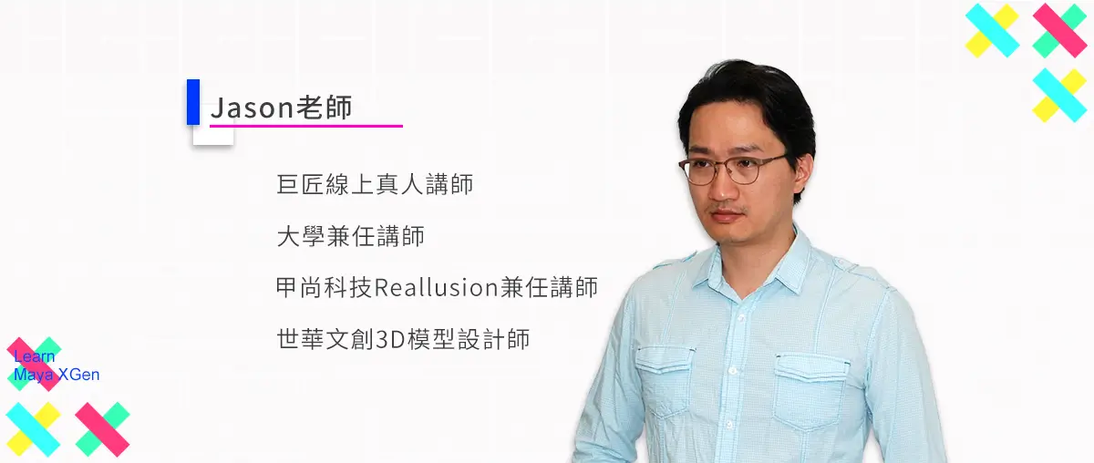 Jason老師專長在於3D動畫等相關領域,過去曾製作過多款影片,如客家電視台「我的NO1表情」片頭設計、高雄園冶獎片頭設計、醫院也瘋狂動畫影片設計等優質作品。現擔任巨匠線上真人講師、大學兼任講師、甲尚兼任講師、世華文創3D模型設計師,不僅業界經歷豐富,教學經驗也相當豐富,並將二者結合貫通,傳遞最實用的實務經驗給學生。