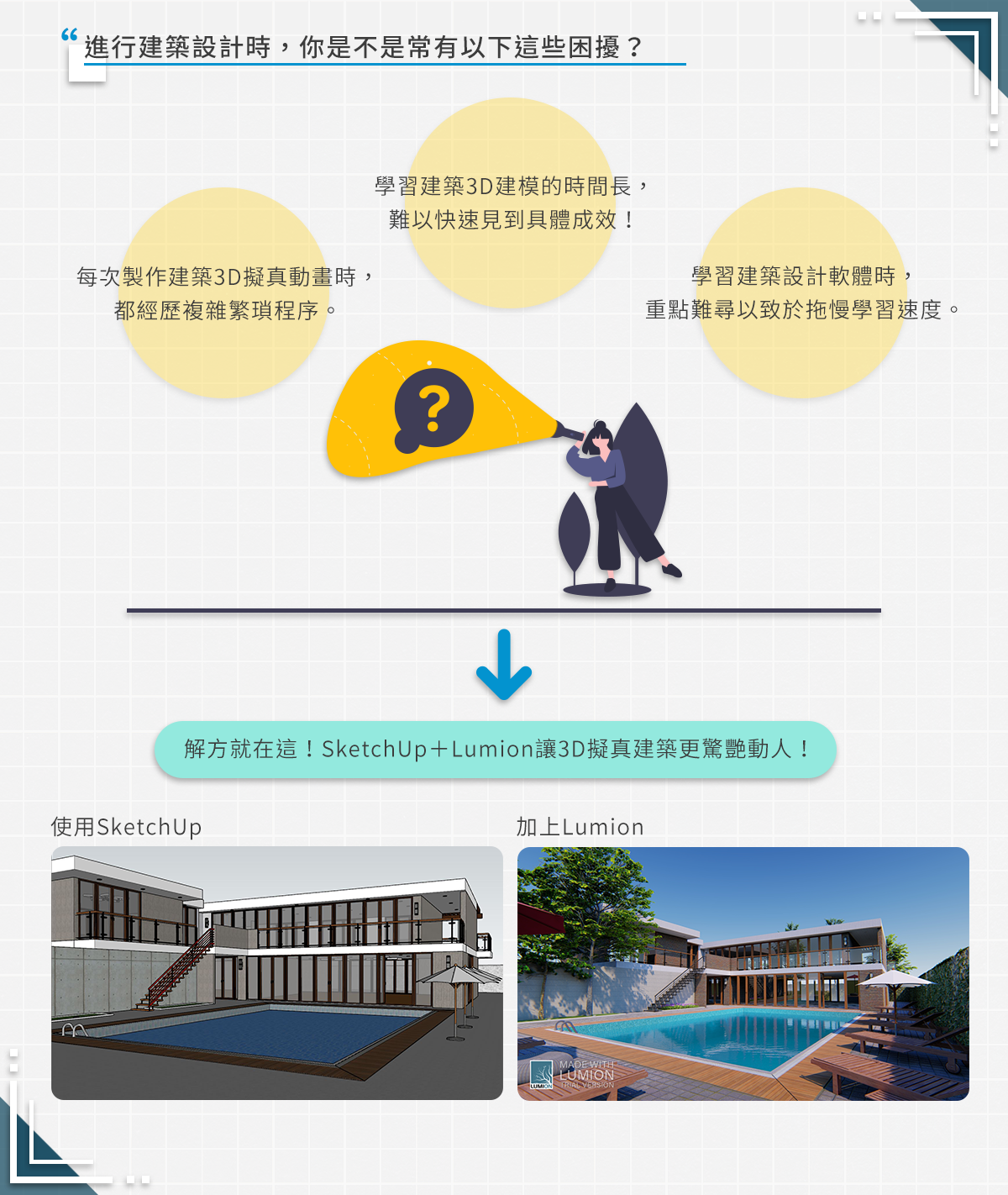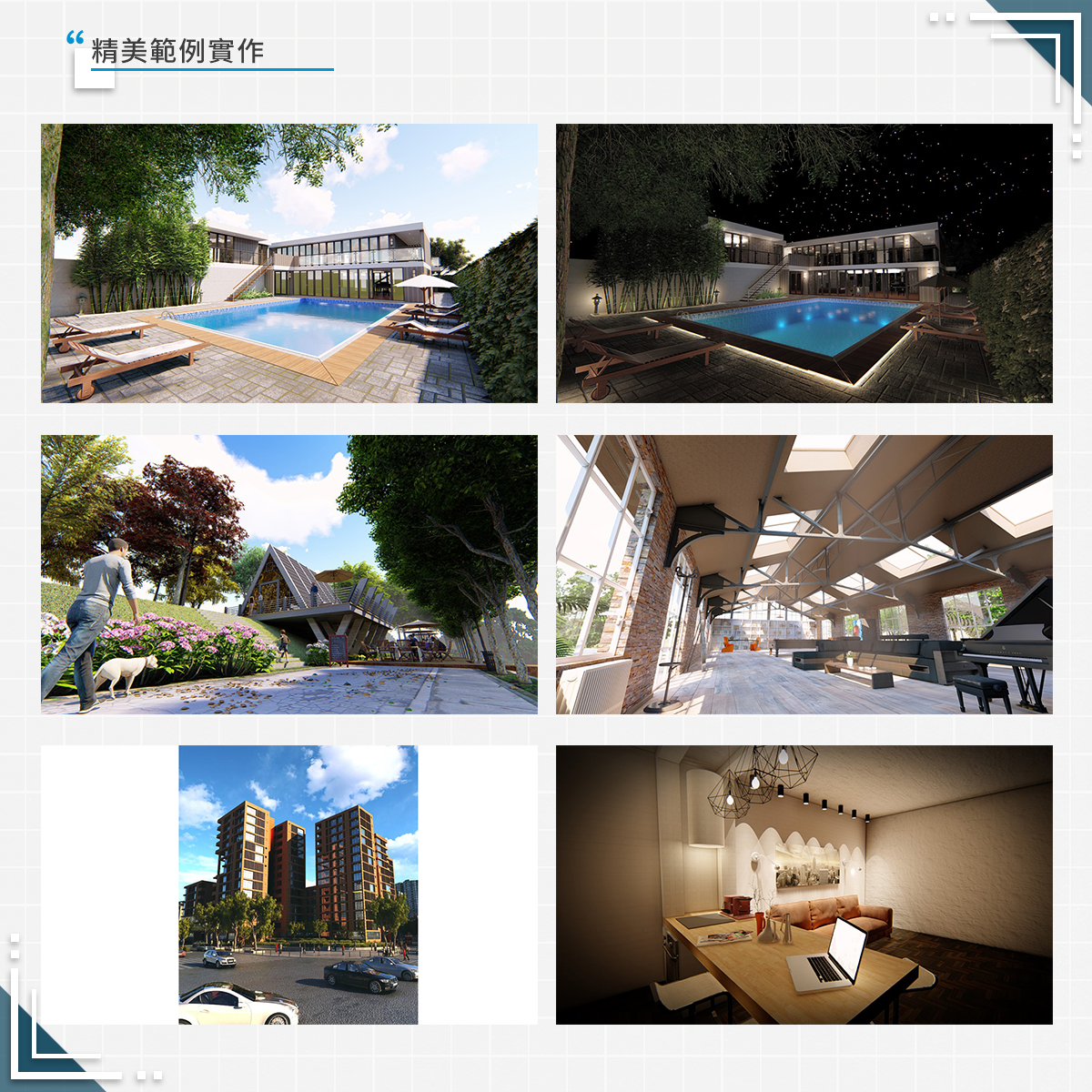 學會SketchUp與Lumion兩款軟體,無論在室內設計產業,還是展場設計產業,或是建築設計產業與都市計畫產業,都能自由運用,模擬與建造各色建築,大大提高職場競爭力。