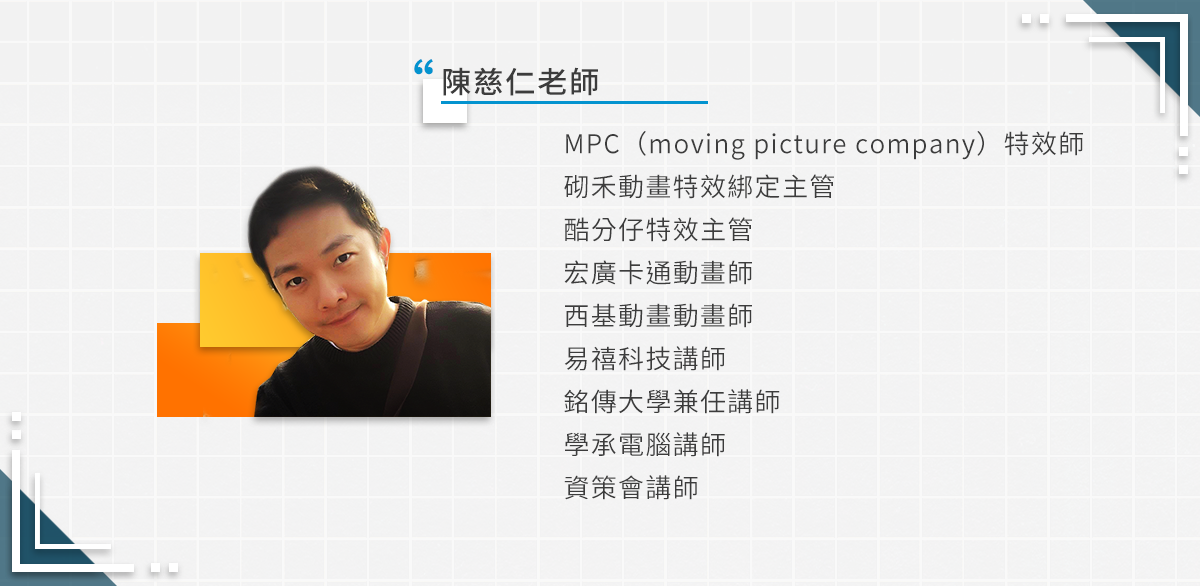 陳慈仁老師專長在3D動畫特效領域,投身於在動畫電視電影後製產業十餘年,過去曾參與「正義聯盟」、「神鬼傳奇」、「自殺突擊隊」、「Final Fantasy 13-2」、「薩利機長」等多部好萊塢電影的電影特效製作。除了具有國內外業界工作經驗外,亦曾在多所補教機關與學校教學3D動畫的製作全過程,多年作育英才,積累豐富的教學經驗。