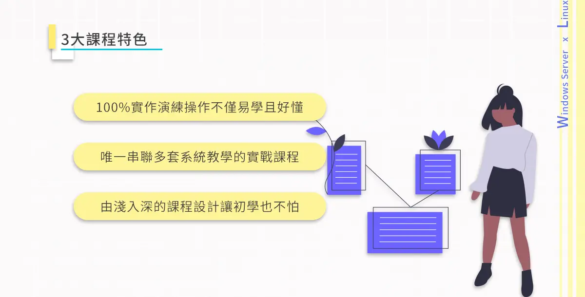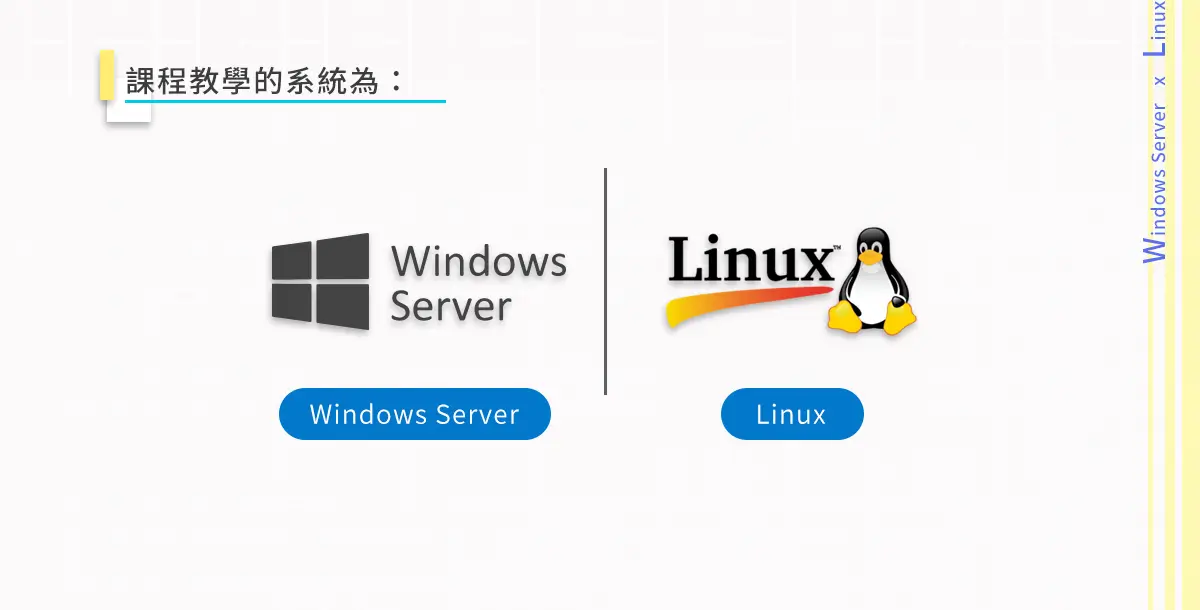 課堂上,教學Windows Server與Linux,有十大課程目標,包含: