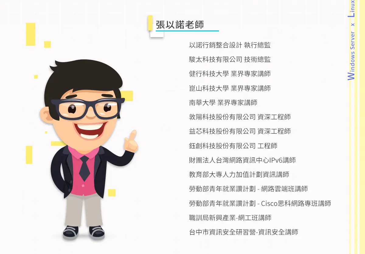 張以諾老師從事網管工程師和網管講師約18年時間,致力研究思科網路設備與Windows伺服器和Linux系統應用,同時擁有Redhat RHCI、Microsoft MCT以及Cisco CCSI三大原廠認證講師資格,實戰經驗豐富,授課時數多達1萬5千小時。近年來也不斷地朝向網路行銷與電商發展,最主要專長在於輔導企業導入資訊系統,並整合各項技術,例如:虛擬化vSphere、Microsoft企業解決方案、Linux開源系統、Cisco設備維運和電商平台等。