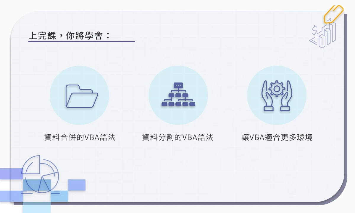在工作的過程中,當每個單位都給你他們的資料,如果你想將這些資料合併成一張工作表,以便日後做資料的分析運用,或許你會開始直接利用複製、貼上的方式慢慢處理,但只要學過這個課程,你就能透過錄製巨集,再修改些巨集語法,加上迴圈,即可一鍵完成資料的合併。此外,當你有一份多達上千筆的資料要依資料的特性分割,一樣可以運用錄製巨集、修改語法的方式完成,加快工作速度。