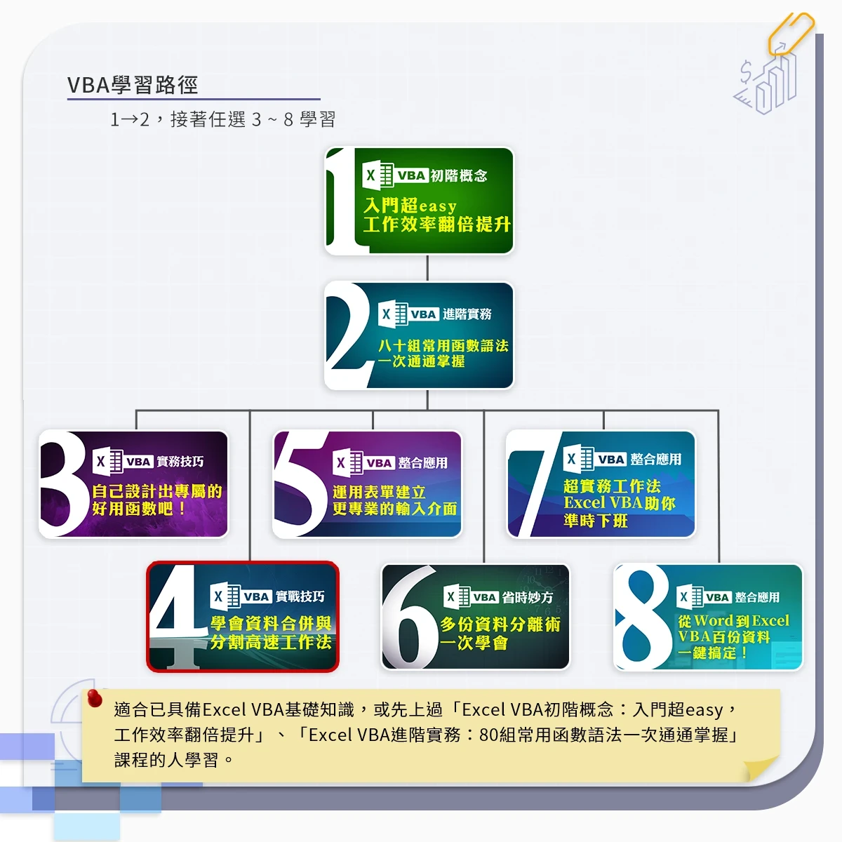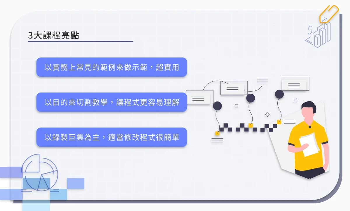 老師將帶你從基礎到進階,再進行實戰,逐步掌握 Excel VBA 整體概念與脈絡,獲得更多好用函數,在應用 Excel 上效率更佳,輕鬆處理工作上惱人的報表與資料。