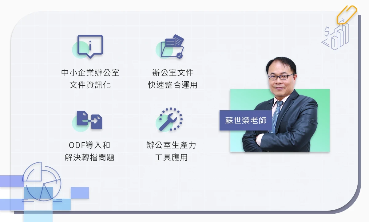 蘇世榮老師的專業強項在於辦公室文件(Office軟體)的資訊化與快速整合運用,以及ODF導入和轉檔,教學時相當擅長以實際案例將複雜內容清楚表達,並在各個政府機關和大專院校擔任過專任講師,長年致力於教學,經驗相當豐富,教齡長達25年,更有眾多精采的著作。