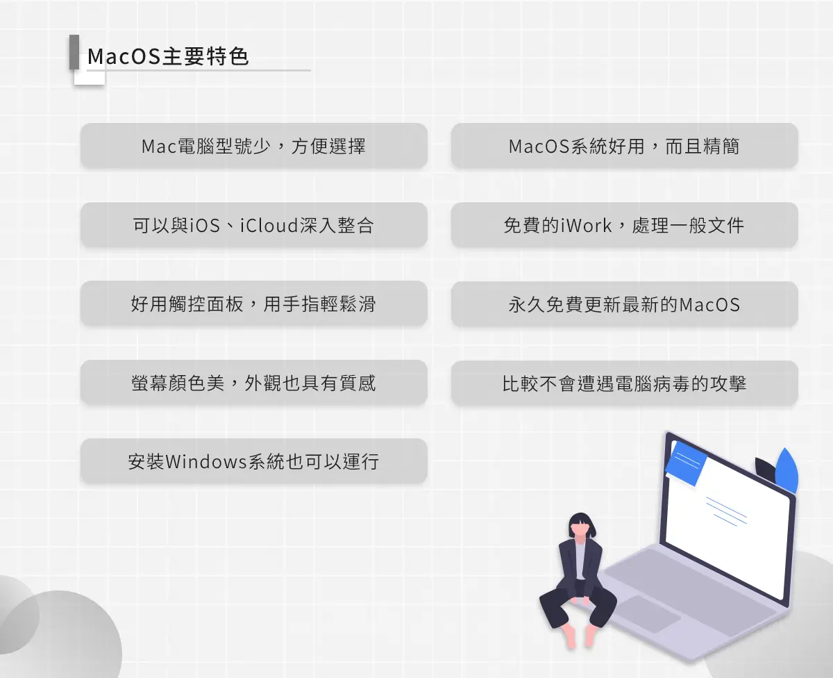 MacOS是由蘋果公司所推出的圖形化使用者介面作業系統,為麥金塔Macintosh電腦的主要作業系統,為世界使用率第二高的作業系統,且具有專屬的特色而為人喜愛。本課程特別針對沒有接觸過MacOS的學員進行教學,希望能大幅降低因操作不熟悉而帶來的使用障礙,讓你輕鬆熟練MacOS系統的運用,未來接觸蘋果產品的使用都能快速上手。