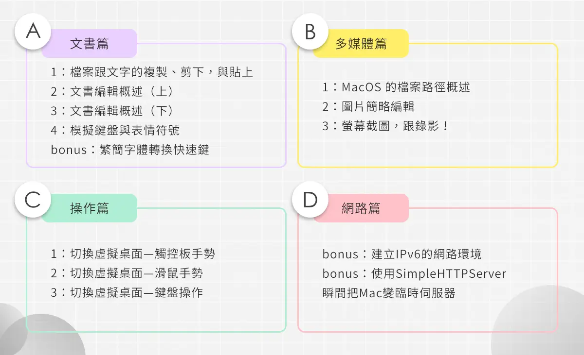 課堂上分為四大部分,分別為文書篇、多媒體篇、操作篇與網路篇,全方位掌握MacOS操作方法。文書篇教學如何編輯一般文件,包含複製、剪下與貼上的主要功能,以及模擬鍵盤、表情符號與快速鍵等相關功能。多媒體篇教學檔案路徑、圖片編輯與錄影等。操作篇講述虛擬桌面的應用,包含觸控板手勢、滑鼠手勢與鍵盤操作等。網路篇則是教你處理網路環境等問題。