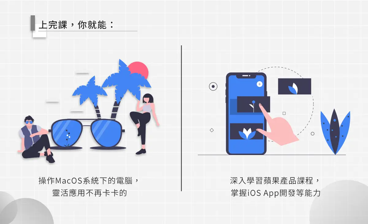 本課程不需要任何的先備能力,適合初步接觸MacOS的人,為你打穩MacOS系統操作與應用的基礎,未來若是學習相關系統下的課程,如iOS App的開發課程「iOS APP開發必學 - 頁面架構設計」等,都能更快上手。