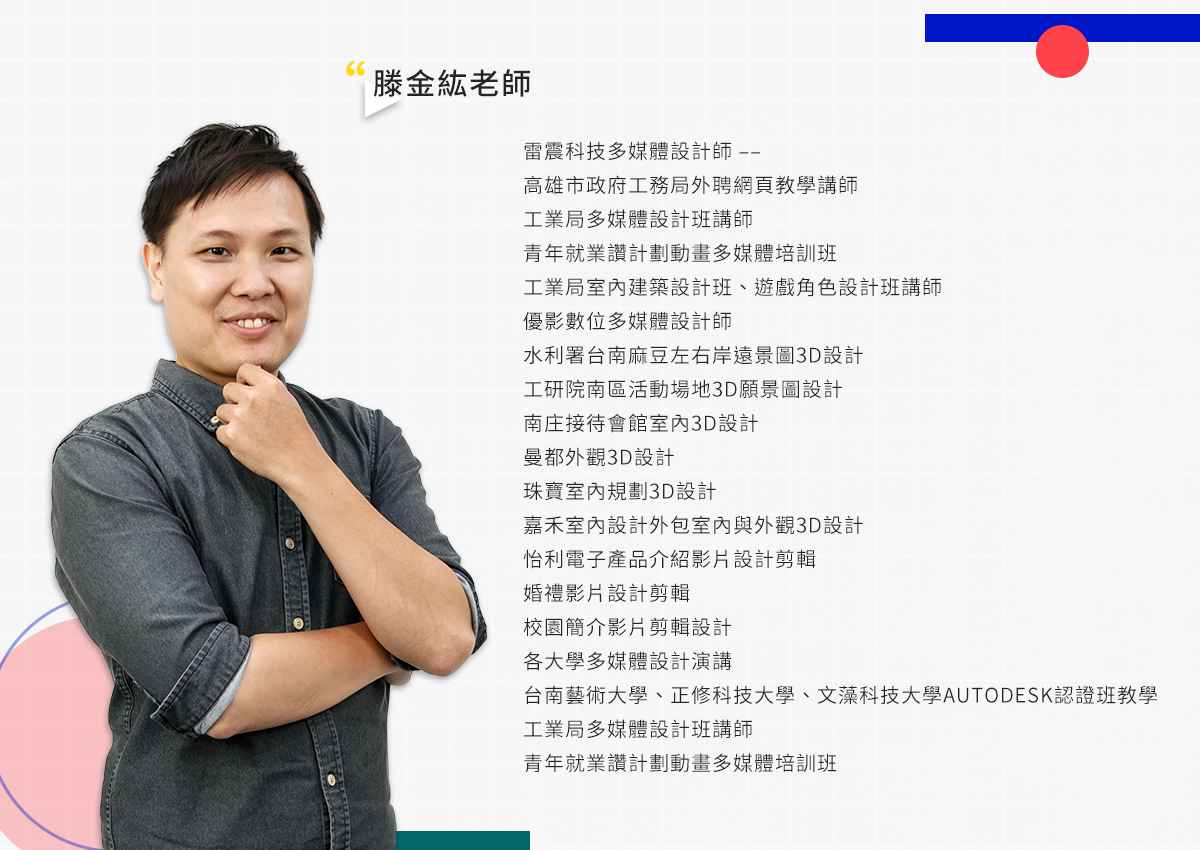 滕金紘老師從事動畫及產品設計專業已長達約13年的時間,致力於視訊、動畫與室內建築設計的領域,近年來不斷往互動式媒體發展,最主要專長在於插畫/漫畫、3D電腦動畫、影像合成、影片後製作、多媒體動畫、線上動畫、線上遊戲、光碟遊戲等範疇。在業界擔任多媒體設計師,協助中小企業完成產品動畫與簡介,也製作過3D遊戲動畫與3D展場動畫,業界經驗豐富;並曾協助多達50位以上的學員進入遊戲動畫職場,如智冠智樂堂與西基動畫公司等。