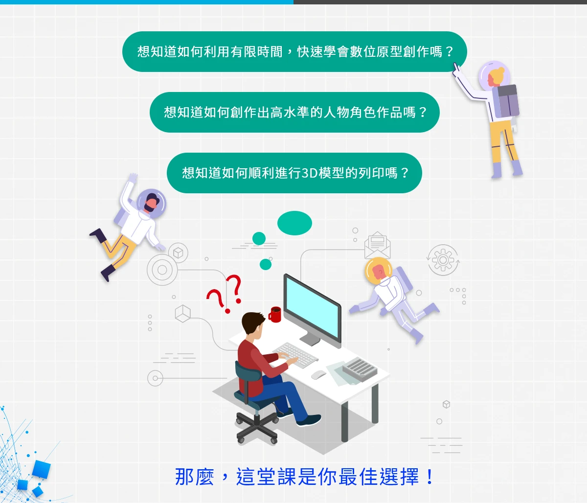 一般 3D 角色建模課程大多僅止於數位作品完成,並未教學如何進一步由3D列印輸出創作成果,因而造成模型公仔無法輸出的遺憾。